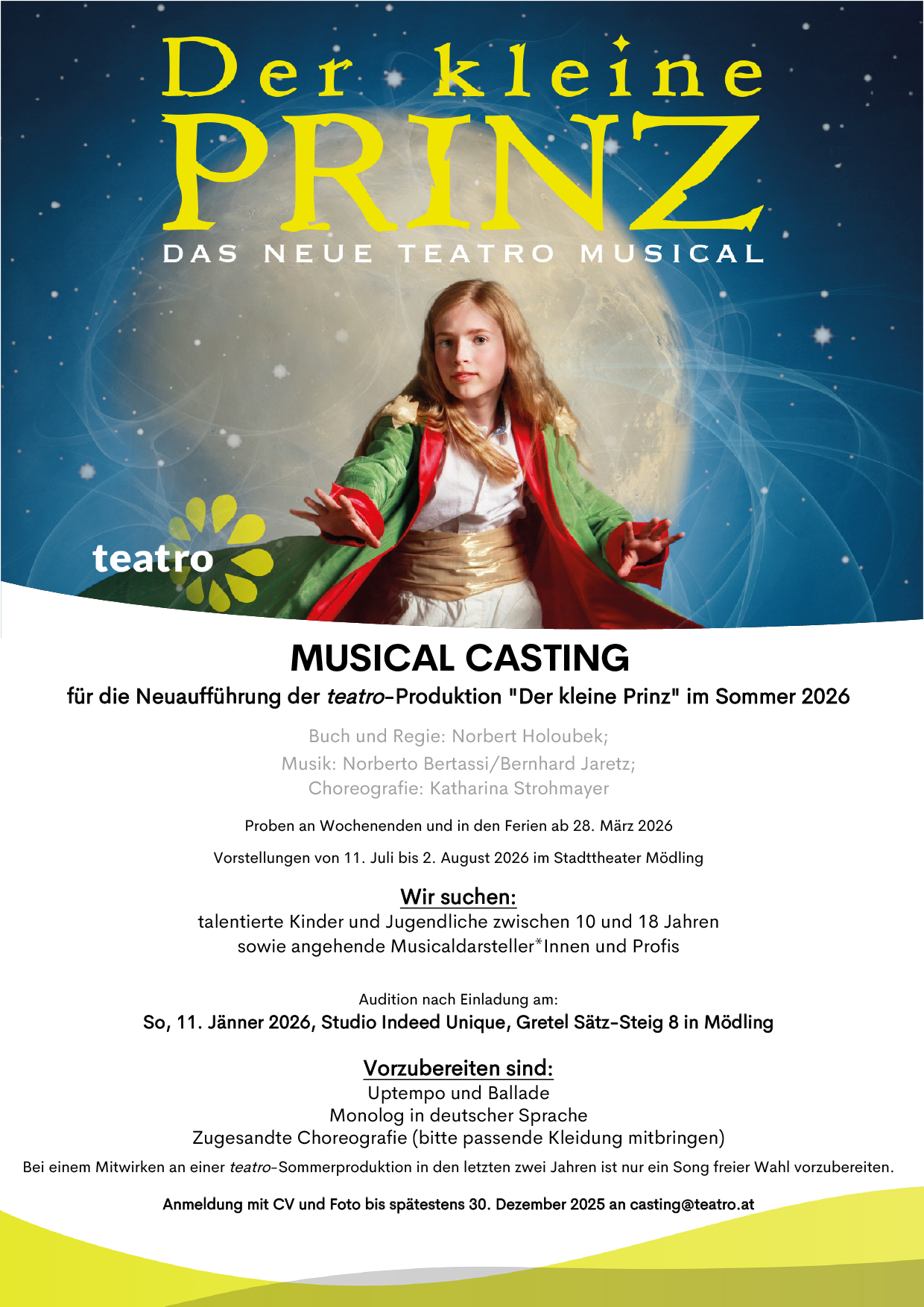 Für die Produktion DER KLEINE PRINZ - Neuaufführung - wird Anfang 2026 im Studio Indeed Unique, Gretel Sätz-Steig 8, in Mödling ein Casting von 10:00 bis 17:00 Uhr stattfinden.