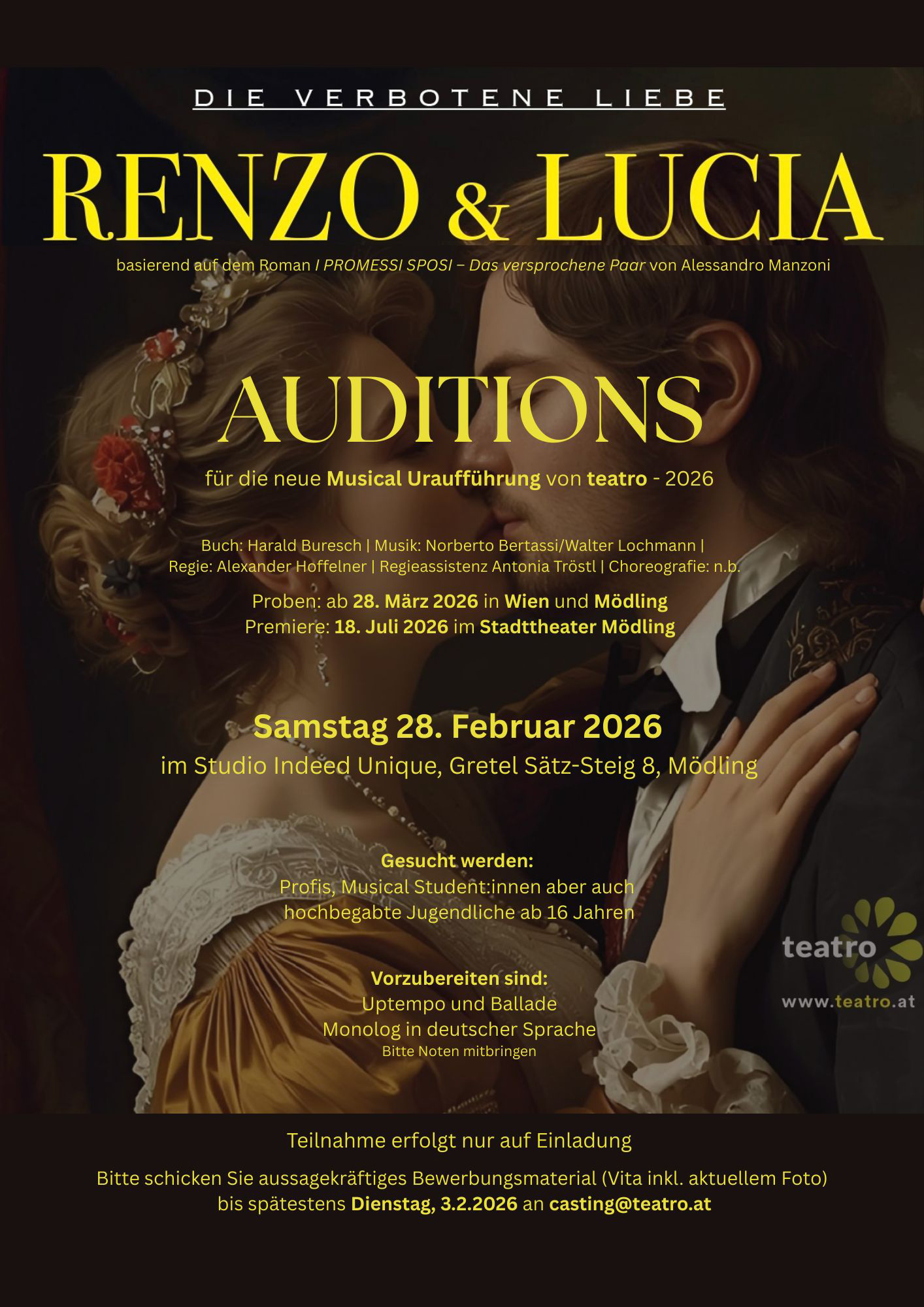 Für die Produktion RENZO & LUCIA - Die verbotene Liebe - nach dem weltberühmten Roman I PROMESSI SPOSI Das versprochene Paar von Alessandro Manzoni - Welturaufführung - wird am 28. Februar 2026 im Studio Indeed Unique, Gretel Sätz-Steig 8, in Mödling ein Casting von 10:00 bis 17:00 Uhr stattfinden.